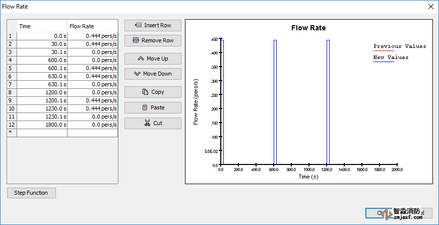 乘客來源,如所示圖10,與離開列車的乘客的列車車門和車站外的兩個源(中的兩條綠色長線圖5)供進入車站登車的乘客使用。列車的出口流是周期性的,如所示圖11.每列火車有15個門,離開火車的時間間隔為30秒,因此流量為0.4444 pers/s每10分鐘就有200名乘客。與進入車站的乘客相關(guān)的來源(30層上的兩條綠色長線圖5)有連續(xù)的流動0.1666秒/秒每列火車。由于有兩個來源和10列火車,這使得每分鐘有200名乘客到達(或每列火車每10分鐘有200名乘客)。因此,進入車站的旅客總到達流量為12000 pers/hr,這與列車流出車站的總流量相匹配。