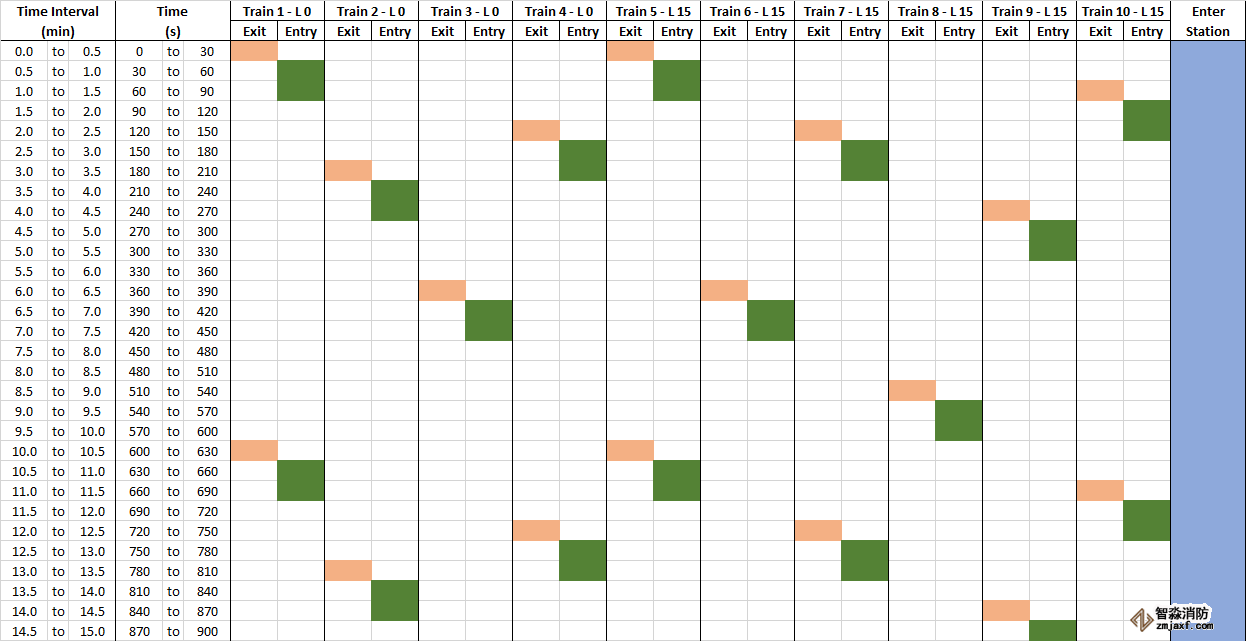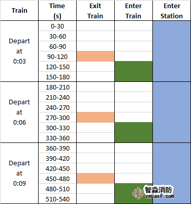 前15分鐘的地鐵時刻表如所示圖9。每列火車每10分鐘到達一次,運送200名乘客。乘客在30秒內(nèi)離開火車,然后排隊的乘客在一分鐘內(nèi)進入火車,火車離開。需要說明的是,Pathfinder實際上并沒有設(shè)置火車到達和離開的動畫,到達和離開是通過打開和關(guān)閉火車和候車室的門來模擬的。