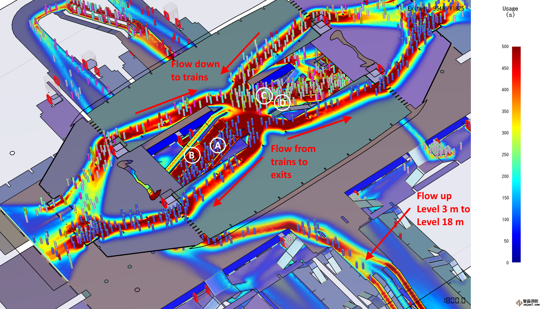 讓我們更詳細地看一下樓梯A和B,它們管理從列車向上的流動,以及樓梯C和D,它們管理向下的流動以登上列車。等高線顯示,A樓梯比B樓梯使用得多。原因是A樓梯鄰近列車從3層向上的氣流,所以更多的乘客使用更近的樓梯。但是因為從15層到18層的兩側(cè)都有向上的水流,所以樓梯B也有很大的用途。向下的水流都全數(shù)從靠近樓梯C的一側(cè)進入,所以它比樓梯d使用得多