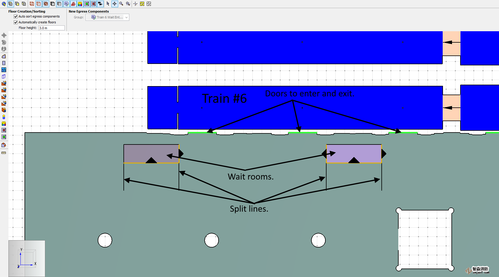 如簡單模型所示,帶有入口和出口門的候車室用于控制進入列車的乘客流量。圖7顯示了位于上部平臺上的6號列車末端車廂的組合計算機輔助設(shè)計和導(dǎo)航網(wǎng)格視圖。你可以看到候車室,進出候車室的單行道,以及火車的出口/入口。中顯示了相應(yīng)的導(dǎo)航網(wǎng)格及其詳細信息圖8。