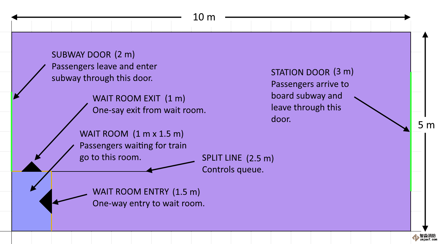 圖3顯示了幾何圖形。右邊的門是車站門。這個門有一個附加的來源,將新的乘客插入模型,車站門也是離開車站的乘客的出口。這等候室利用它的門和分割線是一種利用當前的Pathfinder能力管理隊列的方法。將登上火車的乘客有一個行為這告訴他們?nèi)サ群蚴遥缓蟮降罔F門口下車。除了作為出口之外地鐵門有一個附加的來源,插入乘客然后前往車站門退出。事件的時間如所示圖2連續(xù)不斷的乘客進入車站排隊時,地鐵列車會讓乘客下車30秒鐘,然后候車室的出口門會打開60秒鐘,乘客就會登上列車。然后循環(huán)重復(fù)。