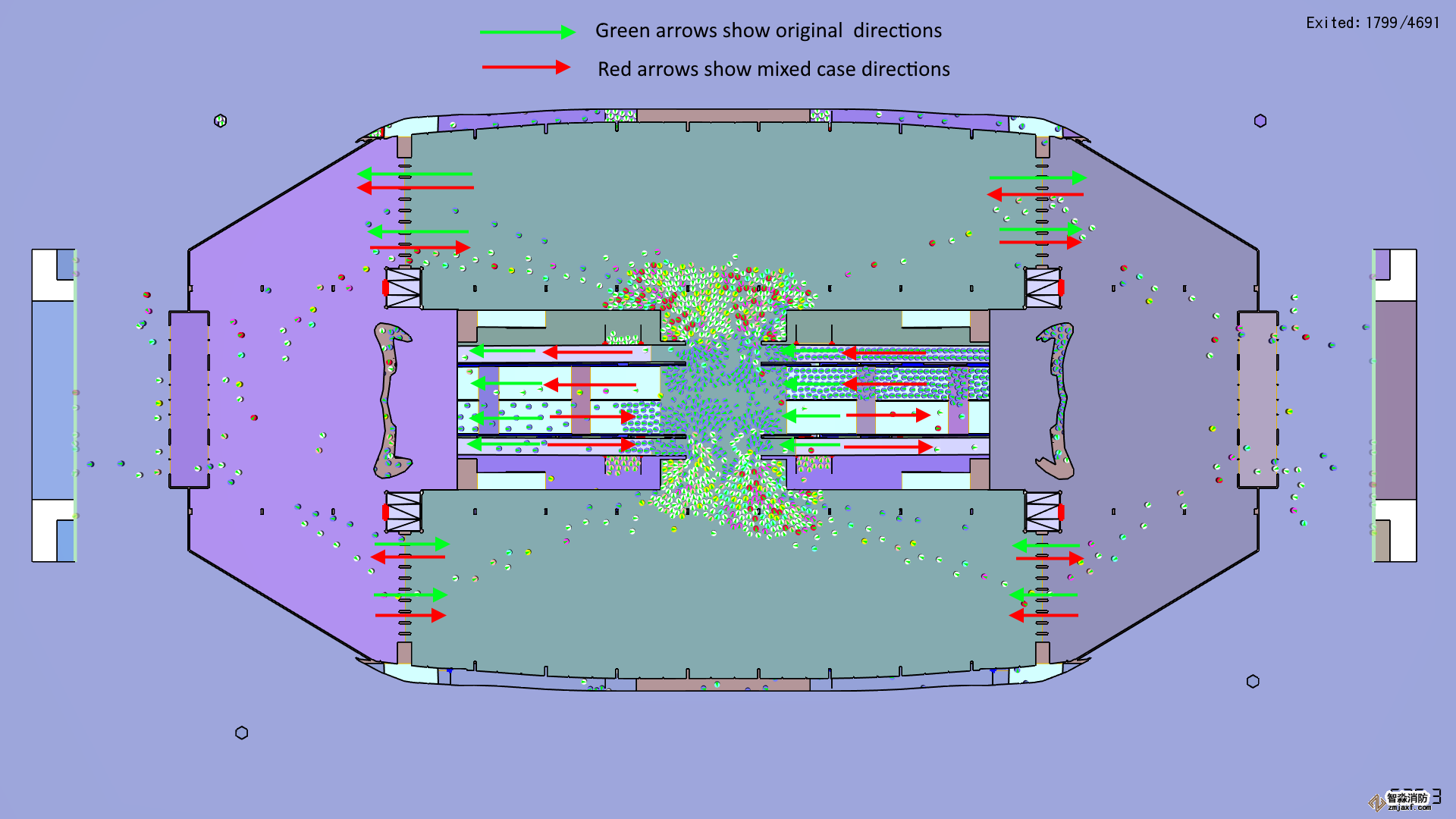 在地鐵模型中,旋轉(zhuǎn)柵門、樓梯和自動扶梯的流動方向被定義為較小化前往列車的乘客和離開車站的乘客之間的交叉流動圖6。為了觀察在30米和18米之間改變流動方向的效果,運行了一個案例,其中旋轉(zhuǎn)柵門、樓梯和自動扶梯的流動方向被重新安排。原始和新的流動方向如所示圖15.現(xiàn)在,樓梯/自動扶梯的右半部分與左半部分的流向不同。