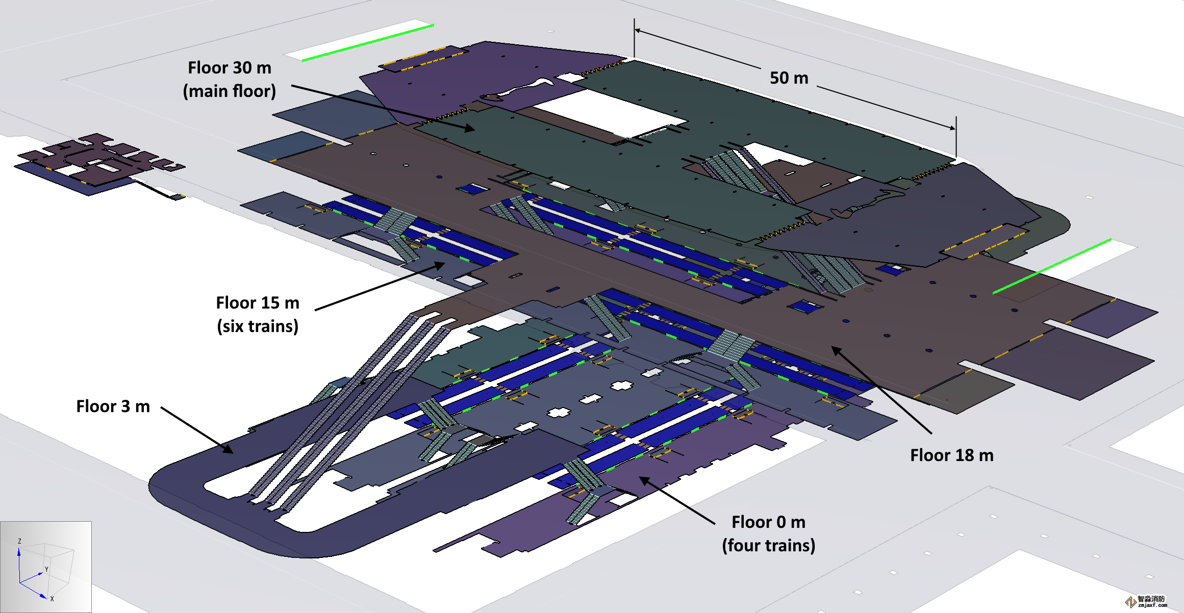 - 樓層18米–該樓層匯集并分配從3米層和15米層流入的全數(shù)流量。樓梯和自動扶梯將18米層連接到30米層。一組樓梯和自動扶梯將流量提升到30米層,一組將流量從30米層降低