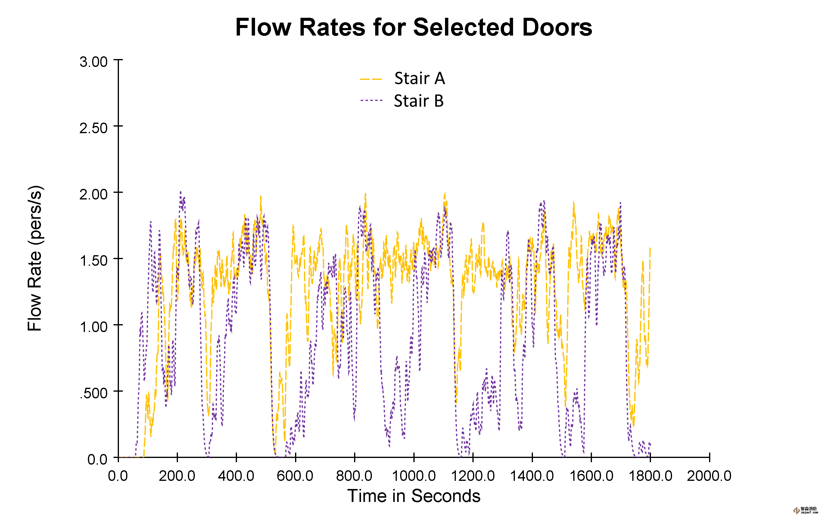 這在樓梯的流速圖中得到證實。圖13顯示了樓梯A和B的上升氣流,同時圖14顯示了樓梯C和D的向下流量。為了比較,這些樓梯的SFPE流量峰值為2.4次/秒。樓梯A和B的向上流動是循環(huán)的,反映了列車的到達。這些樓梯上的峰值流速大約是1次/秒。由于乘客的穩(wěn)定到達,C和D樓梯的向下流動更加穩(wěn)定。樓梯C顯示相對恒定的流速約為2次/秒。