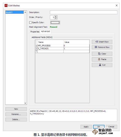 在PyroSim中,附加字段表被添加到網(wǎng)格編輯對(duì)話框的選項(xiàng)卡中,這一新功能允許您額外的MPI和OpenMP參數(shù)添加到PyroSim中的每個(gè)MESH行,而不需手動(dòng)導(dǎo)出和編輯文件從命令行運(yùn)行。http://pg.xfjcyq.com/