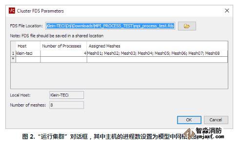 PyroSim中的Run FDSParallel選項(xiàng)將自動(dòng)設(shè)置MPI進(jìn)程數(shù)等于模型中的網(wǎng)格數(shù)。要在PyroSim中使用MPI_PROCESS功能,您需要控制啟動(dòng)模擬的MPI進(jìn)程總數(shù)。這通過(guò)使用Run FDS Cluster選項(xiàng)而不是Run FDS Parallel 來(lái)完成。在圖 2在下面,您可以看到本地計(jì)算機(jī)如何使用單個(gè)主機(jī)名。然后,當(dāng)您在右側(cè)的列表和表下方的字段中看到 8 個(gè)網(wǎng)格時(shí),該主機(jī)的進(jìn)程數(shù)設(shè)置為數(shù)字 4。在這種情況下,將啟動(dòng) 4 個(gè)進(jìn)程,并分配 2 個(gè)網(wǎng)格通過(guò)MPI_PROCESS參數(shù)添加到附加網(wǎng)格記錄中指定的每個(gè)進(jìn)程。