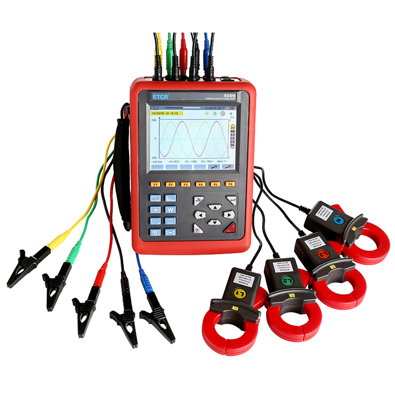 ETCR5000電能質(zhì)量分析儀是我公司精心研制的一款專為現(xiàn)場測試的三相、多功能、智能化、人機操作簡潔的綜合型測試儀器。具有容易使用,超大液晶彩屏顯示,高分辨率,中英文雙語操...ETCR5000電能質(zhì)量分析儀是我公司精心研制的一款專為現(xiàn)場測試的三相、多功能、智能化、人機操作簡潔的綜合型測試儀器。具有容易使用,超大液晶彩屏顯示,高分辨率,中英文雙語操作界面,防振結(jié)構(gòu)外殼等特點??赏瑫r測量4路電流(ABC三相及中性線電流),4路電壓(ABC三相電壓及中性線對地電壓)、電流電壓的峰值、一段時間內(nèi)的蕞大蕞小值、三相不平衡度、短時電壓閃變、變壓器K因數(shù)、有功功率、無功功率、視在功率、功率因數(shù)、位移功率因數(shù)、有功電能、無功電能、視在電能、諧波比、總諧波失真度等;顯示電流電壓的實時波形、相量圖、諧波比柱形圖;動態(tài)捕捉電壓電流瞬時變化,監(jiān)測啟動電流,監(jiān)測各電力參數(shù)并生成告警列表,長時間記錄測試數(shù)據(jù)并生成趨勢曲線圖等功能。