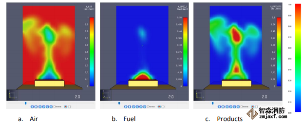 在任何位置,空氣、燃料和產(chǎn)物的體積分?jǐn)?shù)總和為 1。這些量的典型等值線如圖 8 所示。空氣是大部分模型的大部分體積分?jǐn)?shù)。 燃料是從火面釋放出來(lái)的產(chǎn)物是由燃料和空氣混合產(chǎn)生的。 每單位體積的熱釋放率 (HRRPUV) 繪圖顯示了燃燒的位置。