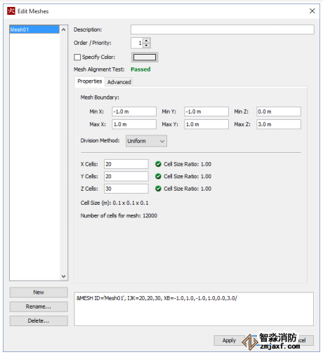 在本例中,我們將使用0.1 m寬的網(wǎng)格單元。該值略小于500 kW火災(zāi)特征直徑(D*)的1/5。根據(jù)經(jīng)驗(yàn)法則,建議的單元尺寸范圍為D*的1/5到1/20,以確保在羽流建模中至少具有中等水平的準(zhǔn)確性(McGrattan,Kevin,et al.2014)。使用較小的網(wǎng)格單元(因子為2)將使誤差減少因子為4,但將使模擬運(yùn)行時(shí)間增加因子為16。