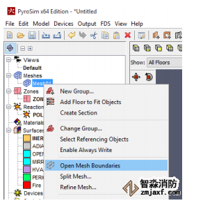 我們希望網(wǎng)的側(cè)面和頂部對(duì)氣流開(kāi)放。這是通過(guò)在這些邊界上創(chuàng)建開(kāi)放曲面來(lái)實(shí)現(xiàn)的。PyroSim可以自動(dòng)為網(wǎng)格的全部邊界執(zhí)行此操作。