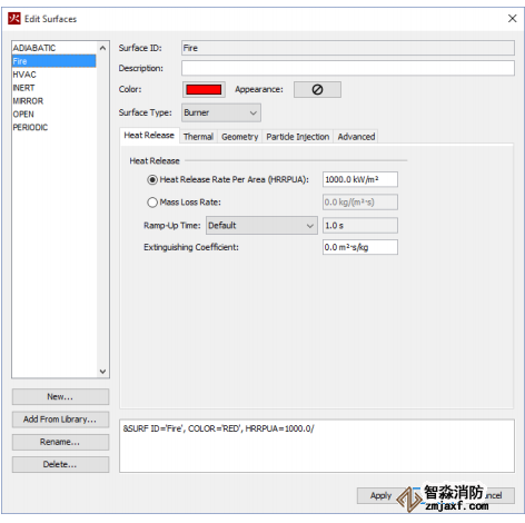 - 定義火災(zāi)大小的熱釋放率(HRR)。當(dāng)指定HRR時(shí),F(xiàn)DS使用反應(yīng)能來(lái)計(jì)算來(lái)自表面的相應(yīng)燃料質(zhì)量流率。